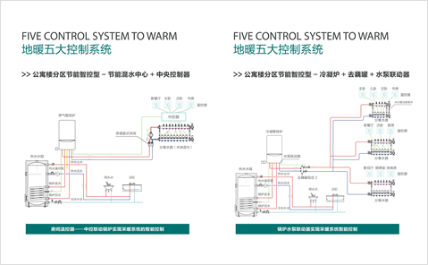 地暖控制系统包括分集水器和温控器,其作用是自由控制各功能区地暖开关和室内温度。